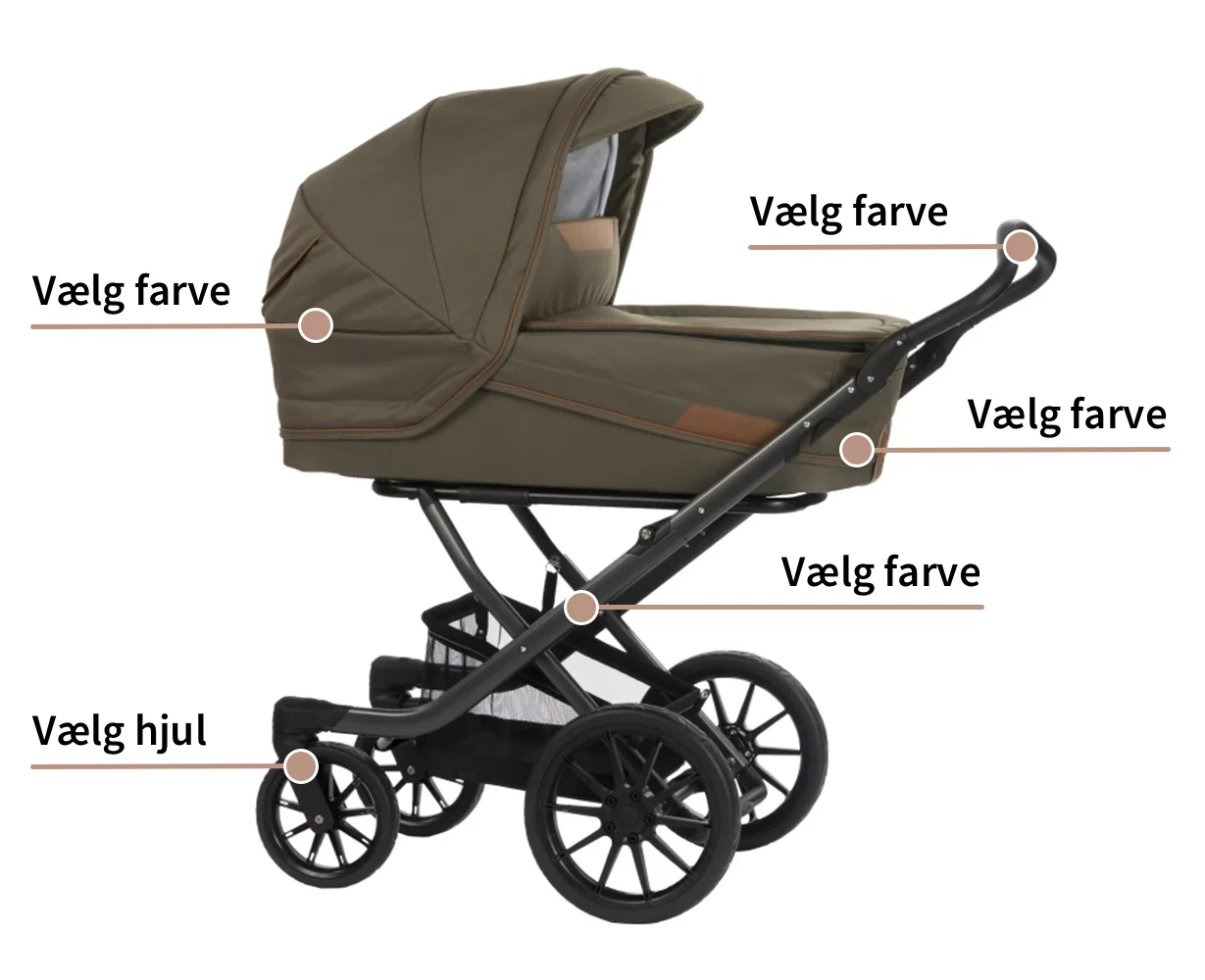 Vi har gjort det nemt for dig at sammensætte den barnevogn, som passer bedst til dig. Ud fra vores standardfarver har du mulighed for at designe din helt egen vogn.